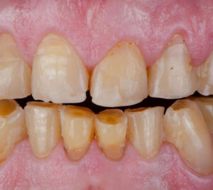 咬耗症は、歯と歯、または歯と食べ物との接触によって歯のかむ面がすり減っている状態です。