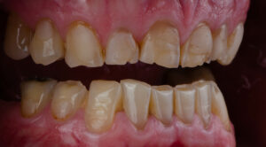 さらに進行すると、歯の表面の光沢が失われ、くすんだ印象になるほか、咬合面が平らになったり、歯の辺縁が丸みを帯びたりして、歯の形態にも変化が現れます。